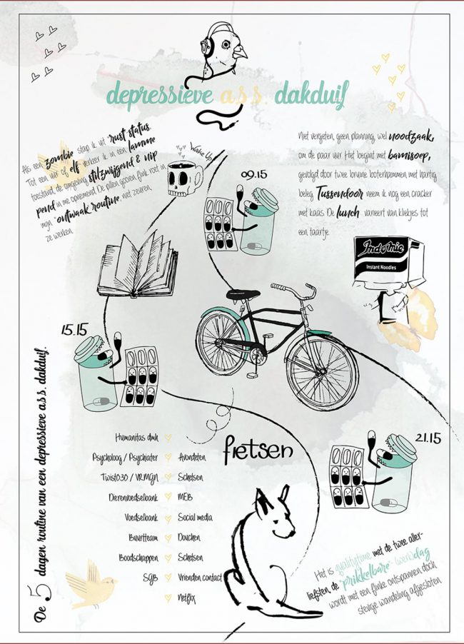 Vrije opdracht met als thema ‘illustreer je week’. Illustratie: Marlous