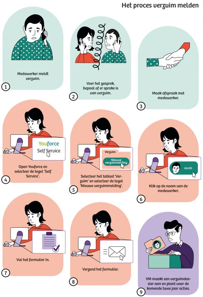 Opdracht: Lister Geef op een helderde manier het proces van ziekteverzuim binnen Lister weer. Maak hierbij gebruik van de huisstijlkleuren van Lister. Illustratie: Bram