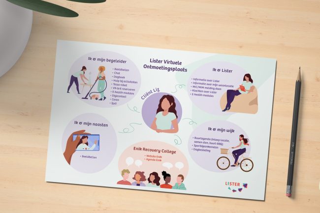 Opdracht: Lister Maak een infographic voor de digitale (virtuele) ontmoetingsplaats Mijn Lister. Vormgeving en illustratie: Nina