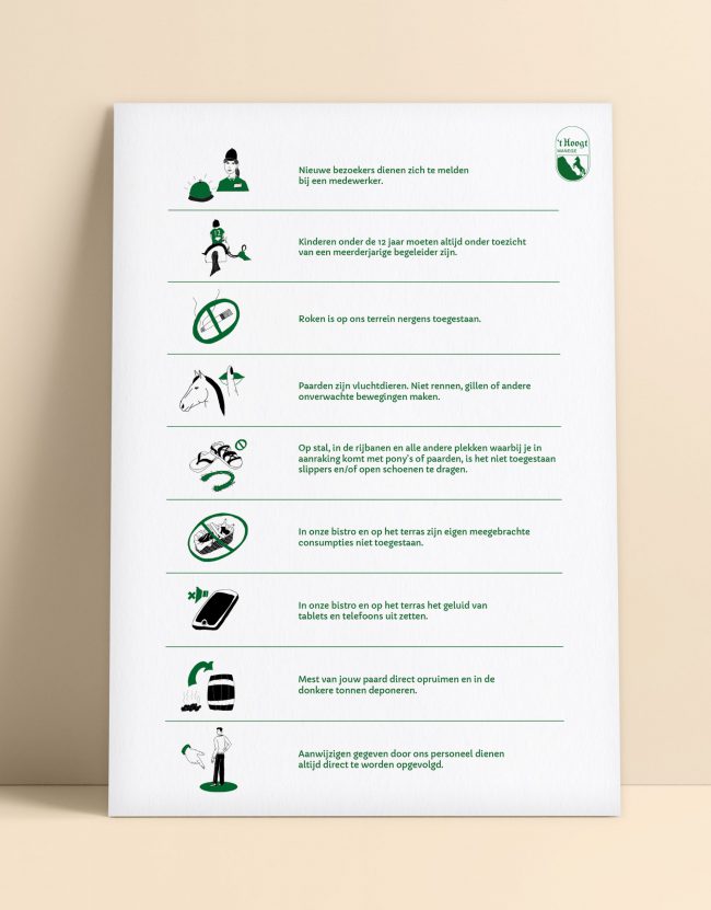 Opdracht: Manege ‘t Hoogt Ontwerp een instructieposter voor de bezoekers van Manege ‘t Hoogt. Vormgeving: Anna (opmaak) Illustratie: Bram (iconen)